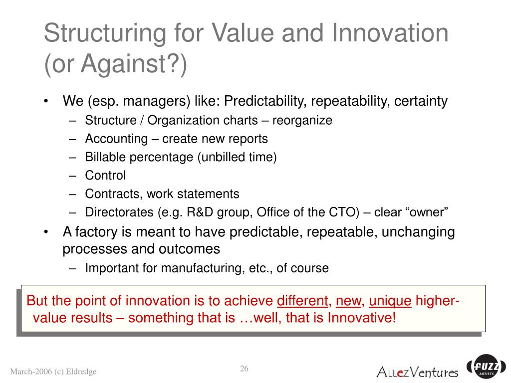 Structuring for Value and Innovation (or Against?) • We (esp. managers) like: Predictability, repeatability, certainty • Structure / Organization charts – reorganize • Accounting – create new reports • Billable percentage (unbilled time) • Control • Contracts, work statements • Directorates (e.g. R&D group, Office of the CTO) – clear “owner” • A factory is meant to have predictable, repeatable, unchanging processes and outcomes • Important for manufacturing, etc., of course But the point of innovation is to achieve different, new, unique higher-value results – something that is …well, that is Innovative!