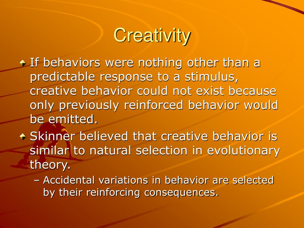 Creativity • If behaviors were nothing other than a predictable response to a stimulus, creative behavior could not exist because only previously reinforced behavior would be emitted. • Skinner believed that creative behavior is similar to natural selection in evolutionary theory. • Accidental variations in behavior are selected by their reinforcing consequences.
