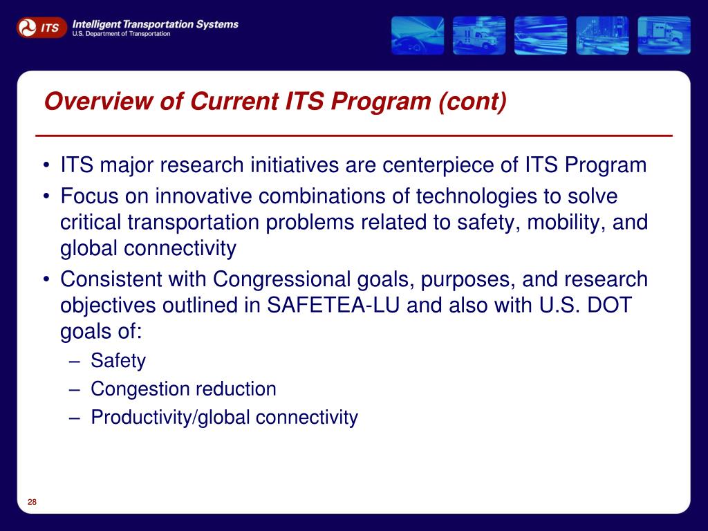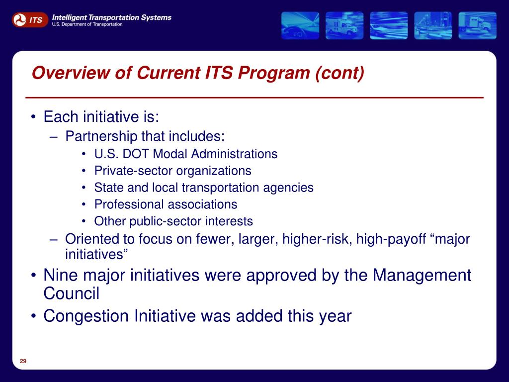 Overview of Current ITS Program (cont) • ITS major research initiatives are centerpiece of ITS Program • Focus on innovative combinations of technologies to solve critical transportation problems related to safety, mobility, and global connectivity • Consistent with Congressional goals, purposes, and research objectives outlined in SAFETEA-LU and also with U.S. DOT goals of: • Safety • Congestion reduction • Productivity/global connectivity 28
