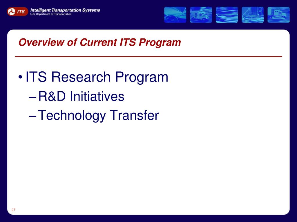 Overview of Current ITS Program • ITS Research Program • R&D Initiatives • Technology Transfer