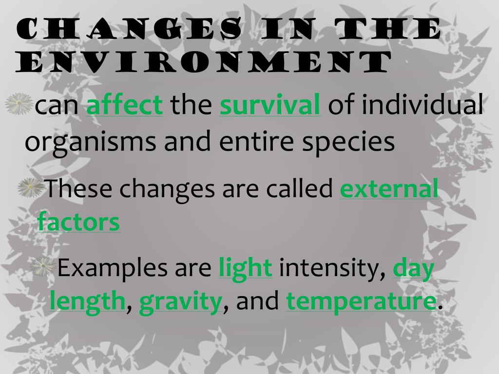 Changes in the Environment • can affect the survival of individual organisms and entire species • These changes are called external factors • Examples are lightintensity, day length, gravity, and temperature.