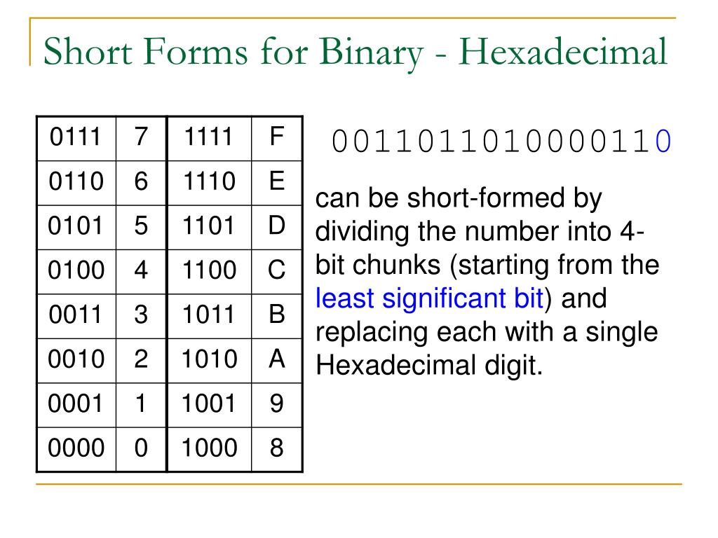 Short Forms for Binary - Hexadecimal 0011011010000110 can be short-formed by dividing the number into 4-bit chunks (starting from the least significant bit) and replacing each with a single Hexadecimal digit.
