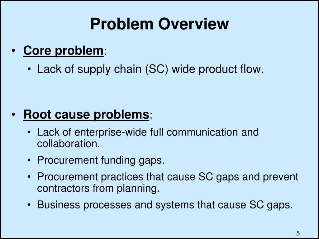 Problem Overview • Core problem: • Lack of supply chain (SC) wide product flow. • Root cause problems: • Lack of enterprise-wide full communication and collaboration. • Procurement funding gaps. • Procurement practices that cause SC gaps and prevent contractors from planning. • Business processes and systems that cause SC gaps.