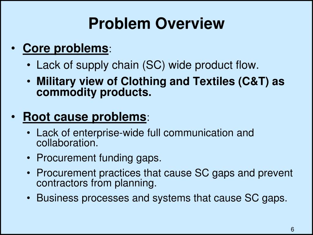 Problem Overview • Core problems: • Lack of supply chain (SC) wide product flow. • Military view of Clothing and Textiles (C&T) as commodity products. • Root cause problems: • Lack of enterprise-wide full communication and collaboration. • Procurement funding gaps. • Procurement practices that cause SC gaps and prevent contractors from planning. • Business processes and systems that cause SC gaps.
