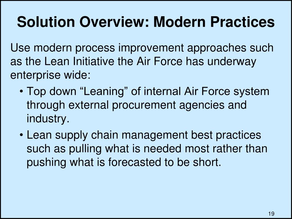 Solution Overview: Modern Practices Use modern process improvement approaches such as the Lean Initiative the Air Force has underway enterprise wide: • Top down “Leaning” of internal Air Force system through external procurement agencies and industry. • Lean supply chain management best practices such as pulling what is needed most rather than pushing what is forecasted to be short.