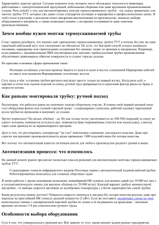 Здравствуйте дорогие друзья. Сегодня затронем тему, которую часто обсуждают технологи и инженеры, работающие с электротехнической продукцией, кабельными сборками или даже крупными промышленными узлами. Речь пойдёт о том, как автоматизировать монтаж термоусаживаемых трубок - тех самых привычных для многих трубок ТУТ, которые уже давно стали стандартом изоляции и маркировки в профессиональных цепях. В этой статье я расскажу о реальном опыте внедрения автоматизации на производстве, нюансах выбора оборудования и материала, а также подводных камнях, с которыми сталкиваются даже опытные производственники. Зачем вообще нужен монтаж термоусаживаемой трубы Стоит заранее разобрать, что именно даёт применение термоусаживаемых трубок ТУТ и почему без них ни один серьёзный кабельный жгут или электрощит не обходится. По сути, это быстрый способ создать надёжную изоляцию, маркировку или герметизацию соединения без лишних затрат по времени и материалам. Например, если сравнить с традиционными ПВХ-изоляторами или лентами, термоусадочная трубка промышленная обеспечивает равномерное обжатие поверхности и служит гораздо дольше. На практике основные сферы применения такие: Изоляция оголённых участков провода Защита от влаги и пыли в местах соединений Маркировка кабелей по цвету или надписям Формирование эстетичных жгутов Суть здесь в чём: установка трубки вручную выглядит просто только на первый взгляд. Когда речь идёт о партиях в сотни или тысячи изделий за смену, ручной труд превращается в серьезный фактор риска по браку и скорости потока. Как раньше монтировали трубку: ручной подход Рассмотрим, что работало ранее на типичном электро-сборочном участке. Я помню свой первый цеховой опыт: стол оборудован феном или газовой горелкой (реже - стационарным туннелем), рабочий надевает нарезанный кусок трубки на проводник и нагревает до усадки. Звучит нормально? На малых объёмах - да. Но как только поток увеличивается до 300-500 операций за смену на одного человека, начинается усталость рук, появляется брак (пережжённые участки или недоусадка), а иногда горят сами провода из-за неравномерного прогрева. Дело в том, что регулировать температуру "на глаз" невозможно одинаково для каждого изделия. Даже при строгих инструкциях производительность редко превышает 1000 изделий/смена без потери качества. Вот потому что автоматизация кажется логичным шагом для любого производства среднего уровня и выше. Автоматизация процесса: что изменилось На данный момент рынок предлагает несколько классов решений для автоматизации монтажа термоусаживаемых трубок ТУТ: Стационарные туннели инфракрасного нагрева Поточные линии с автоматической подачей кабелей/трубки Роботизированные комплексы для сложных сборочных задач Я лично работал с двумя основными подходами: конвейерный ИК-туннель для мелких серий (до 10 000 шт./мес.) и полуавтоматическую линию для высоких объёмов (от 20 000 штук). Каждый вариант требует внимательной настройки - от выбора скорости протяжки до калибровки температуры с учётом характеристик самой трубки. Какие результаты можно достичь? Повысить скорость минимум в два раза без потери качества реально даже при переходе на простейший ИК-туннель средней мощности (2 кВт). Если же поставить экспертные статьи по теме комплексную линию с одновременно