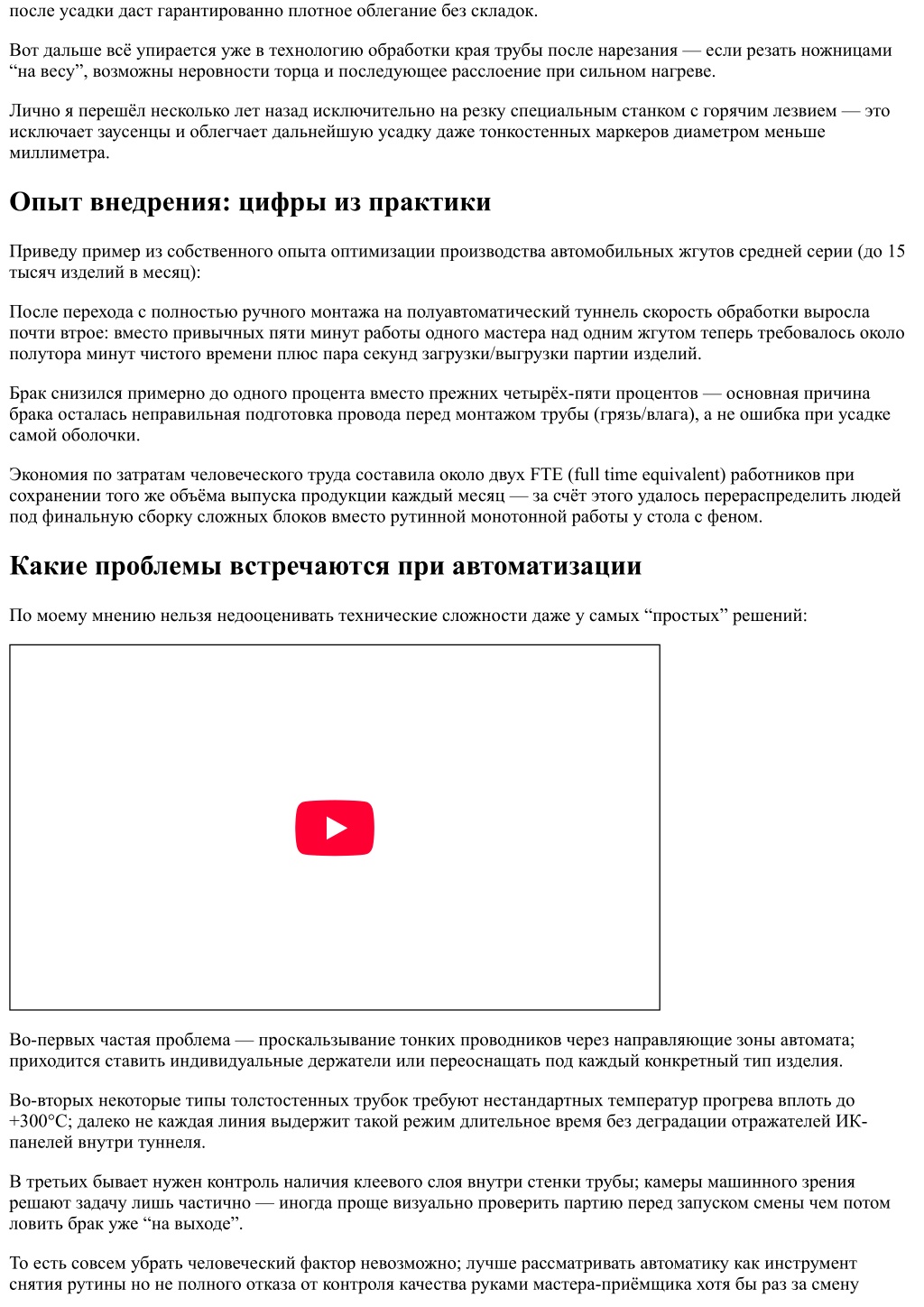 после усадки даст гарантированно плотное облегание без складок. Вот дальше всё упирается уже в технологию обработки края трубы после нарезания — если резать ножницами “на весу”, возможны неровности торца и последующее расслоение при сильном нагреве. Лично я перешёл несколько лет назад исключительно на резку специальным станком с горячим лезвием — это исключает заусенцы и облегчает дальнейшую усадку даже тонкостенных маркеров диаметром меньше миллиметра. Опыт внедрения: цифры из практики Приведу пример из собственного опыта оптимизации производства автомобильных жгутов средней серии (до 15 тысяч изделий в месяц): После перехода с полностью ручного монтажа на полуавтоматический туннель скорость обработки выросла почти втрое: вместо привычных пяти минут работы одного мастера над одним жгутом теперь требовалось около полутора минут чистого времени плюс пара секунд загрузки/выгрузки партии изделий. Брак снизился примерно до одного процента вместо прежних четырёх-пяти процентов — основная причина брака осталась неправильная подготовка провода перед монтажом трубы (грязь/влага), а не ошибка при усадке самой оболочки. Экономия по затратам человеческого труда составила около двух FTE (full time equivalent) работников при сохранении того же объёма выпуска продукции каждый месяц — за счёт этого удалось перераспределить людей под финальную сборку сложных блоков вместо рутинной монотонной работы у стола с феном. Какие проблемы встречаются при автоматизации По моему мнению нельзя недооценивать технические сложности даже у самых “простых” решений: Во-первых частая проблема — проскальзывание тонких проводников через направляющие зоны автомата; приходится ставить индивидуальные держатели или переоснащать под каждый конкретный тип изделия. Во-вторых некоторые типы толстостенных трубок требуют нестандартных температур прогрева вплоть до +300°C; далеко не каждая линия выдержит такой режим длительное время без деградации отражателей ИК- панелей внутри туннеля. В третьих бывает нужен контроль наличия клеевого слоя внутри стенки трубы; камеры машинного зрения решают задачу лишь частично — иногда проще визуально проверить партию перед запуском смены чем потом ловить брак уже “на выходе”. То есть совсем убрать человеческий фактор невозможно; лучше рассматривать автоматику как инструмент снятия рутины но не полного отказа от контроля качества руками мастера-приёмщика хотя бы раз за смену