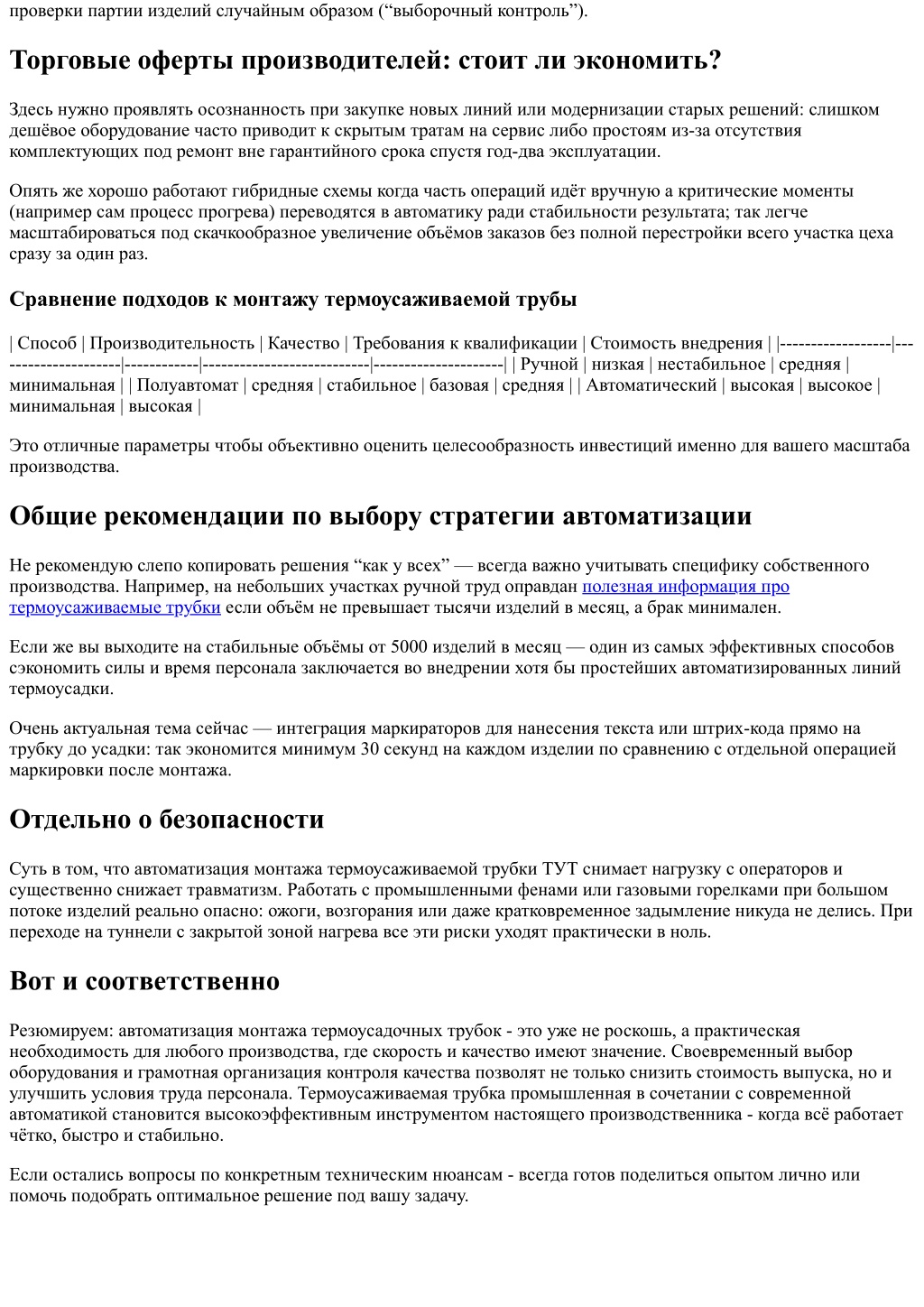 проверки партии изделий случайным образом (“выборочный контроль”). Торговые оферты производителей: стоит ли экономить? Здесь нужно проявлять осознанность при закупке новых линий или модернизации старых решений: слишком дешёвое оборудование часто приводит к скрытым тратам на сервис либо простоям из‑за отсутствия комплектующих под ремонт вне гарантийного срока спустя год-два эксплуатации. Опять же хорошо работают гибридные схемы когда часть операций идёт вручную а критические моменты (например сам процесс прогрева) переводятся в автоматику ради стабильности результата; так легче масштабироваться под скачкообразное увеличение объёмов заказов без полной перестройки всего участка цеха сразу за один раз. Сравнение подходов к монтажу термоусаживаемой трубы | Способ | Производительность | Качество | Требования к квалификации | Стоимость внедрения | |------------------|--- ------------------|------------|---------------------------|---------------------| | Ручной | низкая | нестабильное | средняя | минимальная | | Полуавтомат | средняя | стабильное | базовая | средняя | | Автоматический | высокая | высокое | минимальная | высокая | Это отличные параметры чтобы объективно оценить целесообразность инвестиций именно для вашего масштаба производства. Общие рекомендации по выбору стратегии автоматизации Не рекомендую слепо копировать решения “как у всех” — всегда важно учитывать специфику собственного производства. Например, на небольших участках ручной труд оправдан полезная информация про термоусаживаемые трубки если объём не превышает тысячи изделий в месяц, а брак минимален. Если же вы выходите на стабильные объёмы от 5000 изделий в месяц — один из самых эффективных способов сэкономить силы и время персонала заключается во внедрении хотя бы простейших автоматизированных линий термоусадки. Очень актуальная тема сейчас — интеграция маркираторов для нанесения текста или штрих-кода прямо на трубку до усадки: так экономится минимум 30 секунд на каждом изделии по сравнению с отдельной операцией маркировки после монтажа. Отдельно о безопасности Суть в том, что автоматизация монтажа термоусаживаемой трубки ТУТ снимает нагрузку с операторов и существенно снижает травматизм. Работать с промышленными фенами или газовыми горелками при большом потоке изделий реально опасно: ожоги, возгорания или даже кратковременное задымление никуда не делись. При переходе на туннели с закрытой зоной нагрева все эти риски уходят практически в ноль. Вот и соответственно Резюмируем: автоматизация монтажа термоусадочных трубок - это уже не роскошь, а практическая необходимость для любого производства, где скорость и качество имеют значение. Своевременный выбор оборудования и грамотная организация контроля качества позволят не только снизить стоимость выпуска, но и улучшить условия труда персонала. Термоусаживаемая трубка промышленная в сочетании с современной автоматикой становится высокоэффективным инструментом настоящего производственника - когда всё работает чётко, быстро и стабильно. Если остались вопросы по конкретным техническим нюансам - всегда готов поделиться опытом лично или помочь подобрать оптимальное решение под вашу задачу.