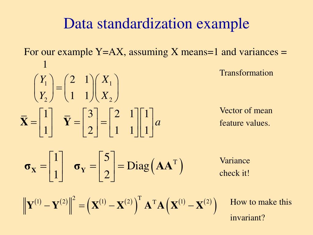 Data standardization example Transformation Vector of mean feature values. Variance check it! For our example Y=AX, assuming X means=1 and variances = 1 How to make this invariant?