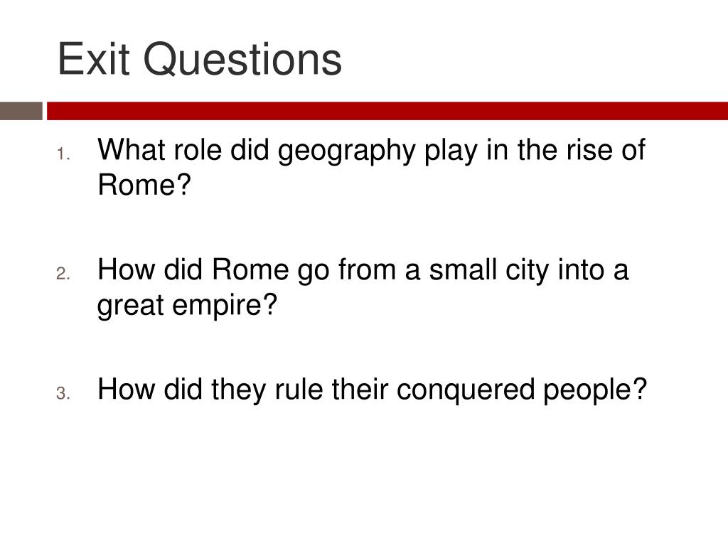 Exit Questions • What role did geography play in the rise of Rome? • How did Rome go from a small city into a great empire? • How did they rule their conquered people?