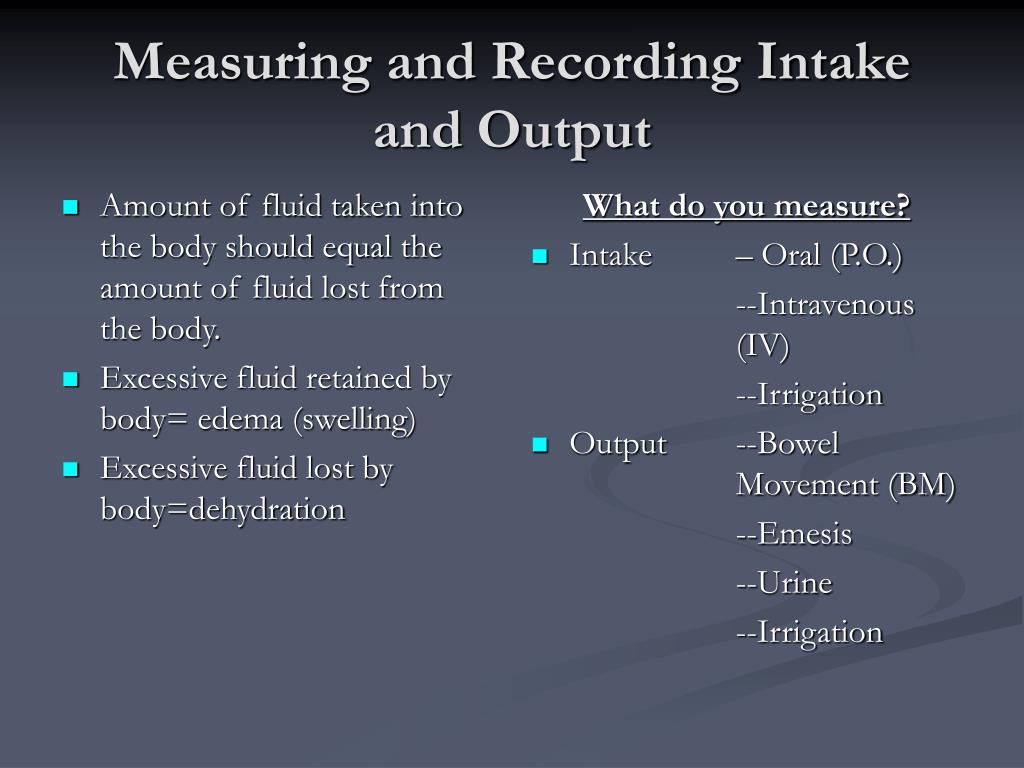 Amount of fluid taken into the body should equal the amount of fluid lost from the body. Excessive fluid retained by body= edema (swelling) Excessive fluid lost by body=dehydration What do you measure? Intake – Oral (P.O.) --Intravenous (IV) --Irrigation Output --Bowel Movement (BM) --Emesis --Urine --Irrigation Measuring and Recording Intake and Output