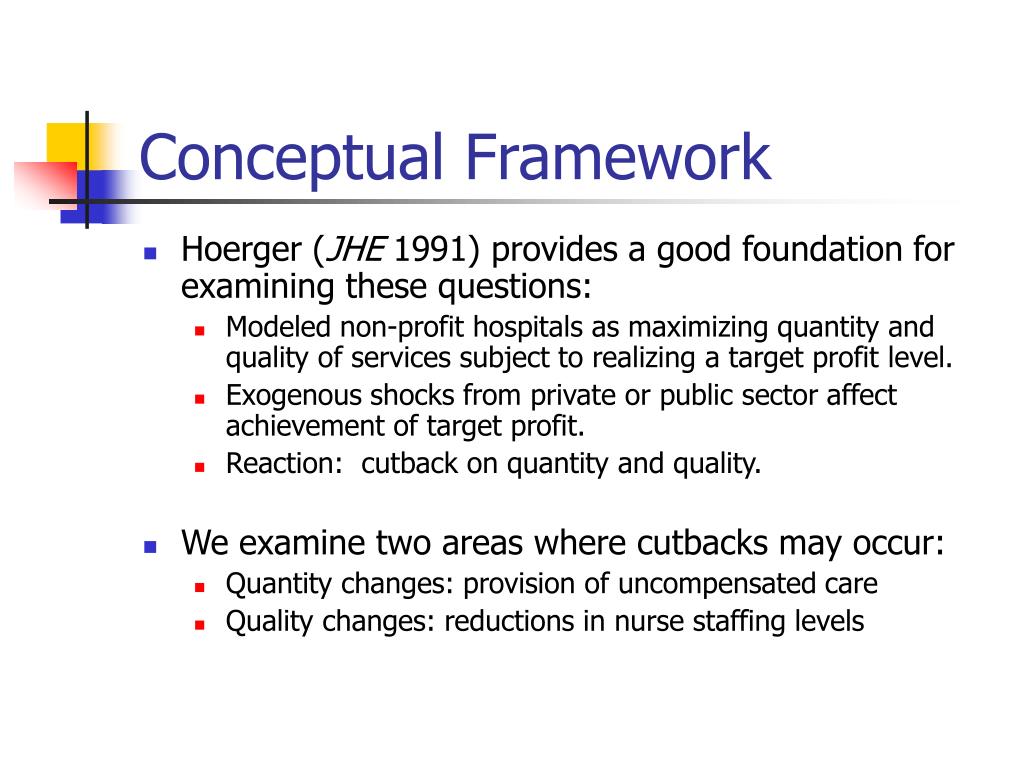 Conceptual Framework • Hoerger (JHE 1991) provides a good foundation for examining these questions: • Modeled non-profit hospitals as maximizing quantity and quality of services subject to realizing a target profit level. • Exogenous shocks from private or public sector affect achievement of target profit. • Reaction: cutback on quantity and quality. • We examine two areas where cutbacks may occur: • Quantity changes: provision of uncompensated care • Quality changes: reductions in nurse staffing levels
