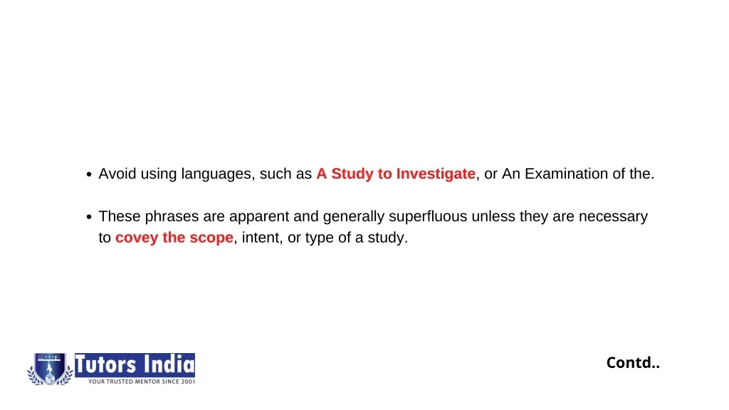 Avoid using languages, such as A Study to Investigate, or An Examination of the. These phrases are apparent and generally superfluous unless they are necessary to covey the scope, intent, or type of a study. Contd..