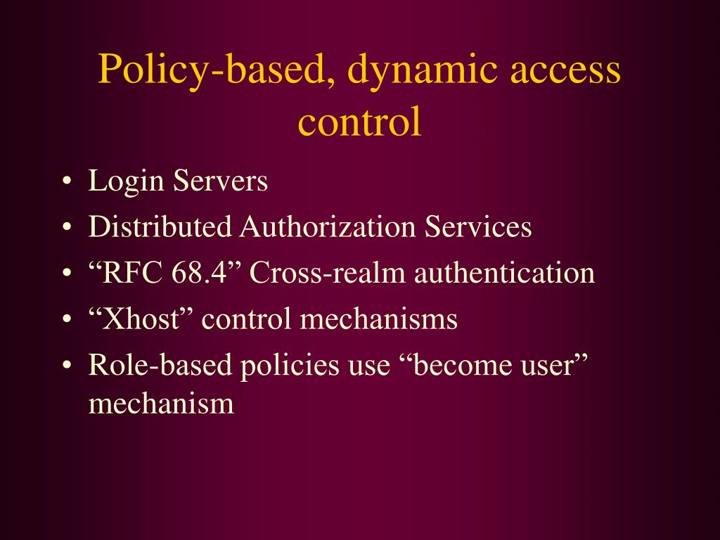 Policy-based, dynamic access control • Login Servers • Distributed Authorization Services • “RFC 68.4” Cross-realm authentication • “Xhost” control mechanisms • Role-based policies use “become user” mechanism