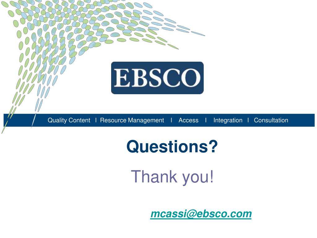 mcassi@ebsco.com Quality Content l Resource Management l Access l Integration l Consultation Questions?Thank you!