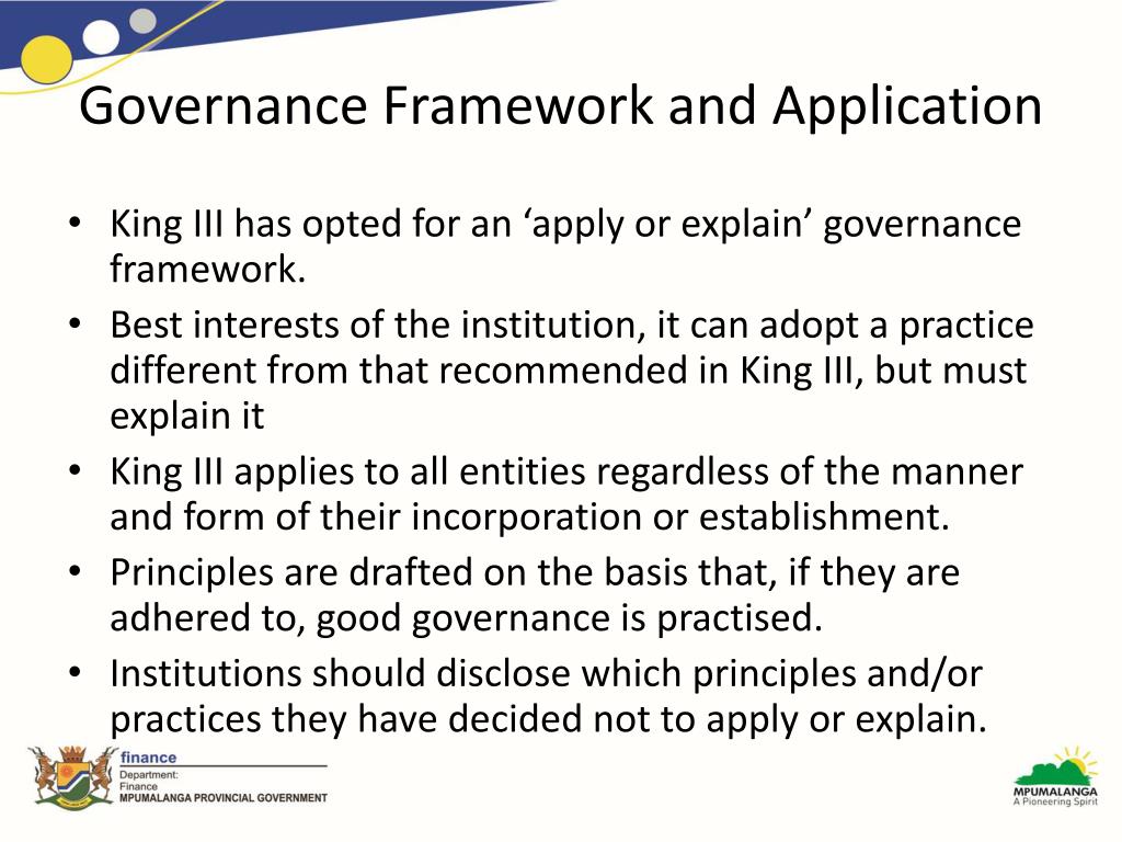 Governance Framework and Application • King III has opted for an ‘apply or explain’ governance framework. • Best interests of the institution, it can adopt a practice different from that recommended in King III, but must explain it • King III applies to all entities regardless of the manner and form of their incorporation or establishment. • Principles are drafted on the basis that, if they are adhered to, good governance is practised. • Institutions should disclose which principles and/or practices they have decided not to apply or explain.