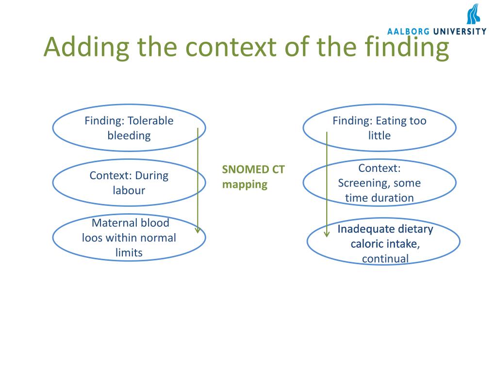 Adding the context of the finding Finding: Tolerable bleeding Finding: Eating too little Context: During labour SNOMEDCT mapping Context: Screening, some time duration Maternal blood loos within normal limits Inadequate dietary caloric intake, continual Inadequate dietary caloric intake, continual