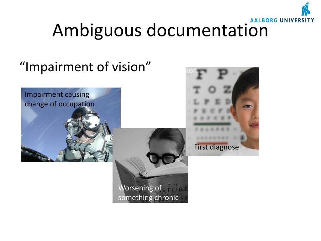 Ambiguous documentation “Impairment of vision” Impairment causing change of occupation First diagnose Worsening of something chronic