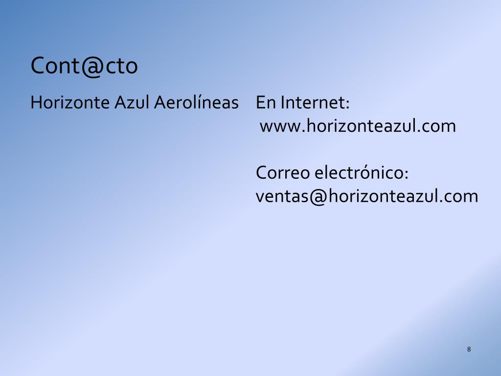 Cont@cto En Internet: www.horizonteazul.com Correo electrónico: ventas@horizonteazul.com Horizonte Azul Aerolíneas