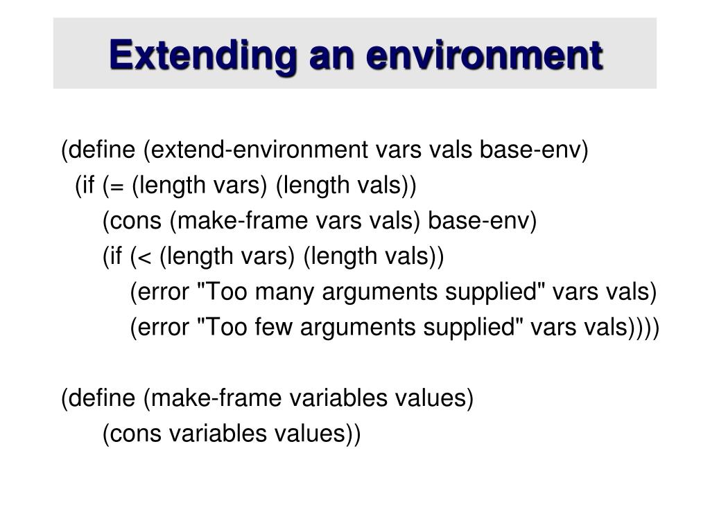 Extending an environment (define (extend-environment vars vals base-env) (if (= (length vars) (length vals)) (cons (make-frame vars vals) base-env) (if (< (length vars) (length vals)) (error "Too many arguments supplied" vars vals) (error "Too few arguments supplied" vars vals)))) (define (make-frame variables values) (cons variables values))