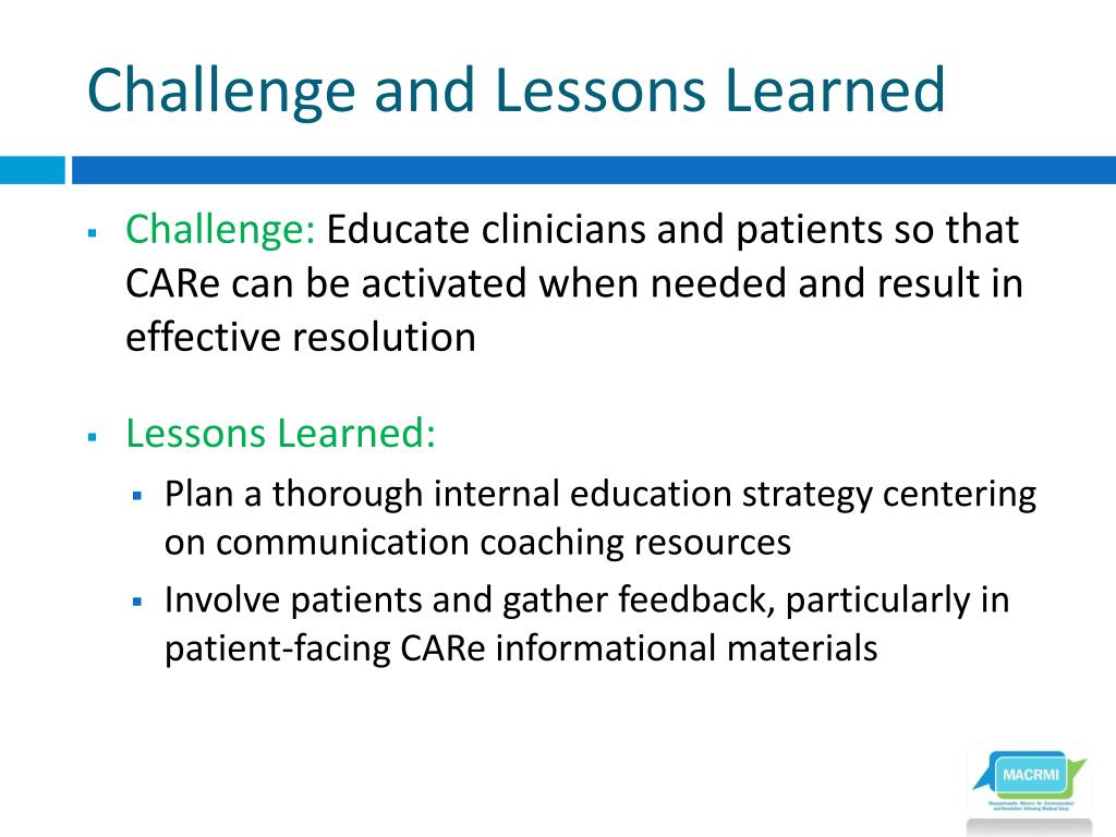 Challenge and Lessons Learned • Challenge: Educate clinicians and patients so that CARe can be activated when needed and result in effective resolution • Lessons Learned: • Plan a thorough internal education strategy centering on communication coaching resources • Involve patients and gather feedback, particularly in patient-facing CARe informational materials