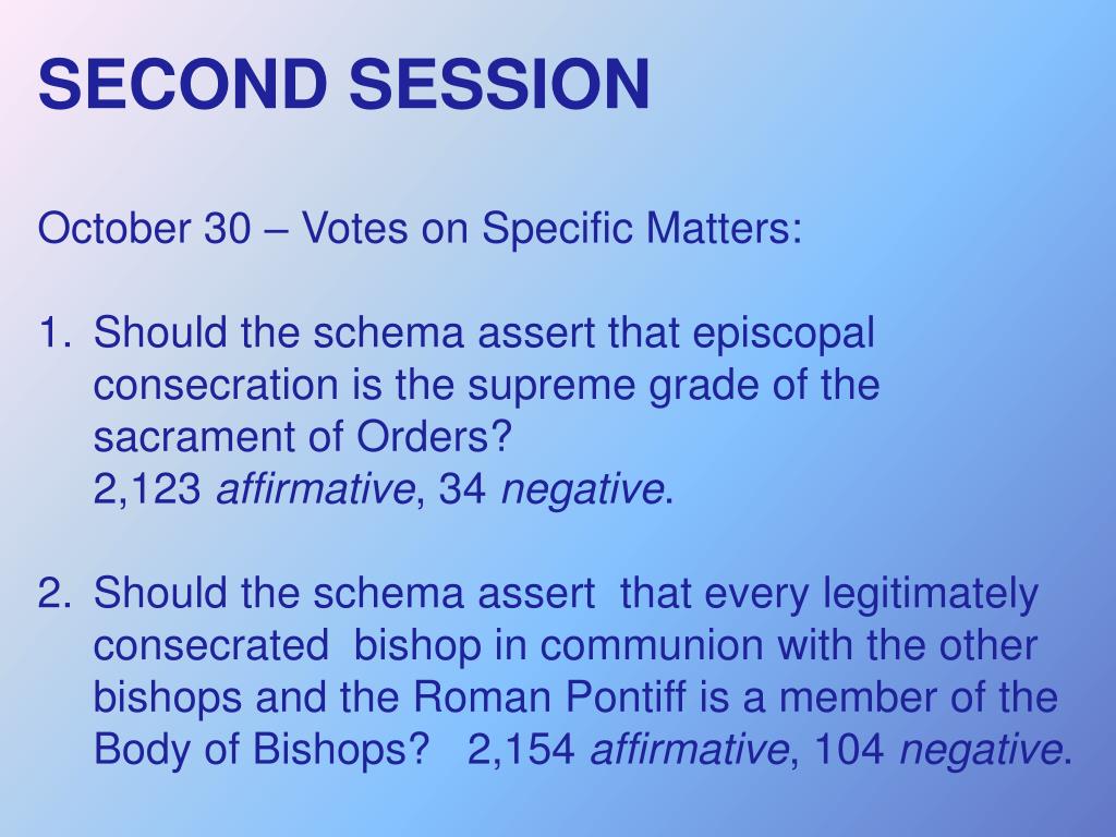SECOND SESSION October 30 – Votes on Specific Matters: Should the schema assert that episcopal consecration is the supreme grade of the sacrament of Orders? 2,123 affirmative, 34 negative. Should the schema assert that every legitimately consecrated bishop in communion with the other bishops and the Roman Pontiff is a member of the Body of Bishops? 2,154 affirmative, 104 negative.