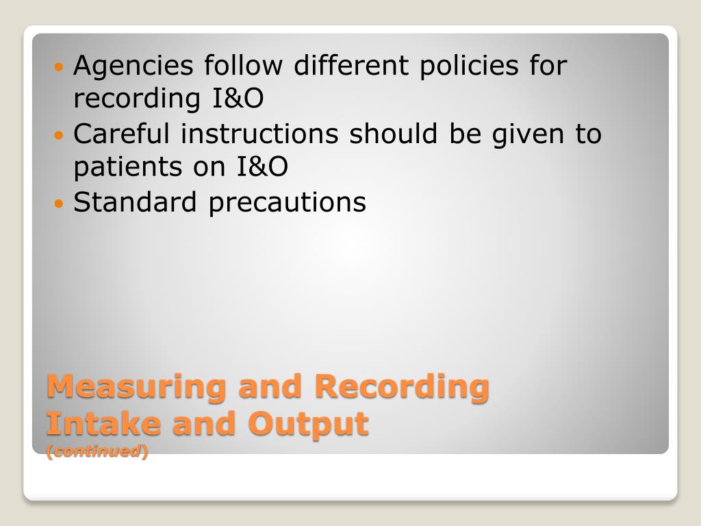 Agencies follow different policies for recording I&O • Careful instructions should be given to patients on I&O • Standard precautions Measuring and RecordingIntake and Output(continued)