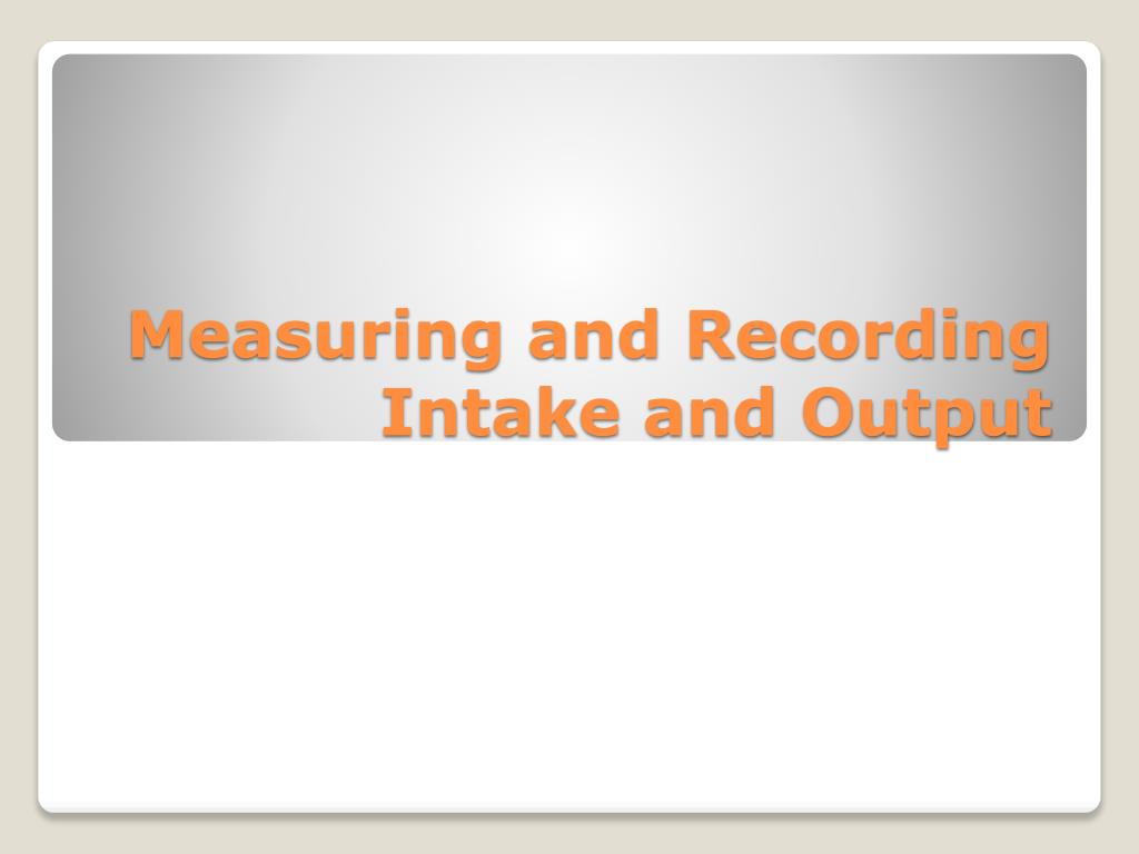 Intake: fluids taken in by patient • What is included in intake • Output: fluids eliminated by patient • What is included in output • Records must be accurate • Fluids usually measured by metric system Measuring and RecordingIntake and Output(continued)