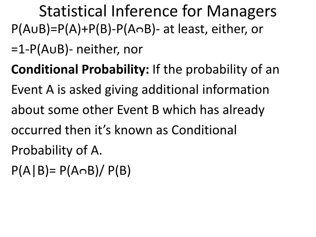 Statistical Inference for Managers P(AᴜB)=P(A)+P(B)-P(AᴒB)- at least, either, or =1-P(AᴜB)- neither, nor Conditional Probability: If the probability of an Event A is asked giving additional information about some other Event B which has already occurred then it’s known as Conditional Probability of A. P(A|B)= P(AᴒB)/ P(B)