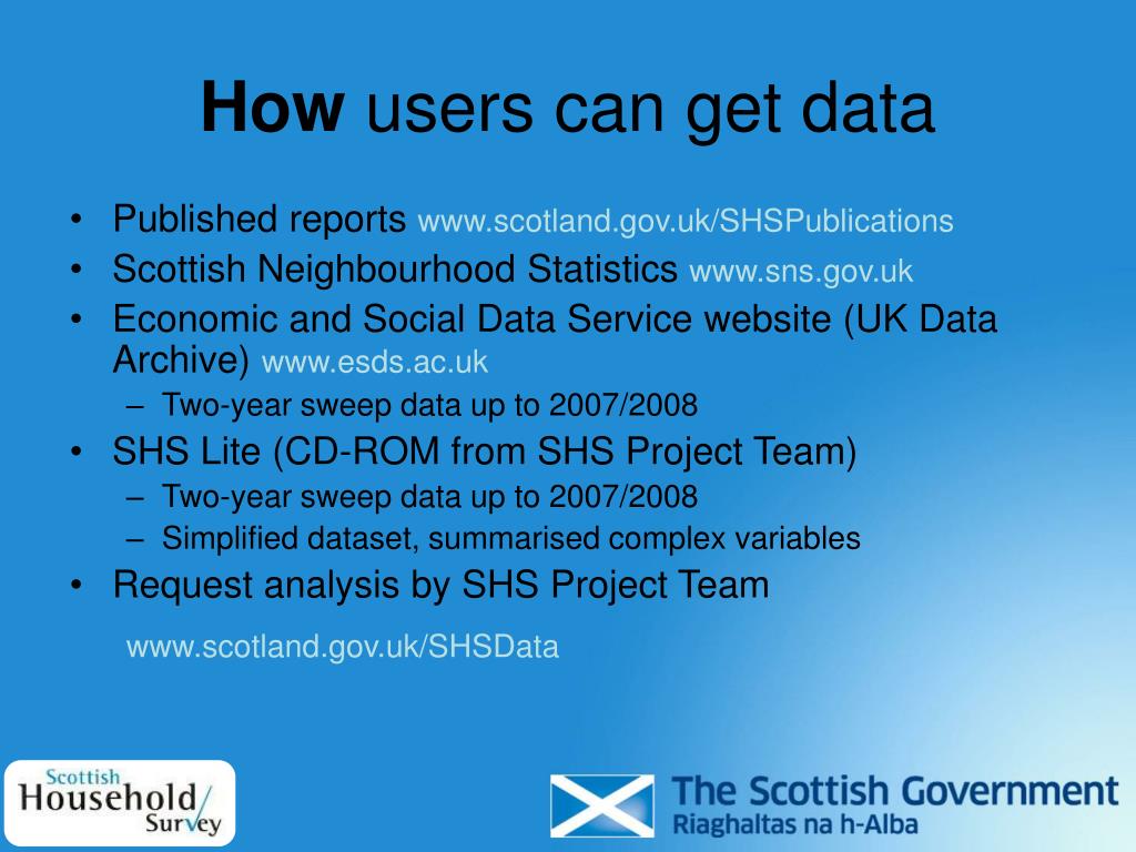 How users can get data • Published reports www.scotland.gov.uk/SHSPublications • Scottish Neighbourhood Statistics www.sns.gov.uk • Economic and Social Data Service website (UK Data Archive) www.esds.ac.uk • Two-year sweep data up to 2007/2008 • SHS Lite (CD-ROM from SHS Project Team) • Two-year sweep data up to 2007/2008 • Simplified dataset, summarised complex variables • Request analysis by SHS Project Team www.scotland.gov.uk/SHSData