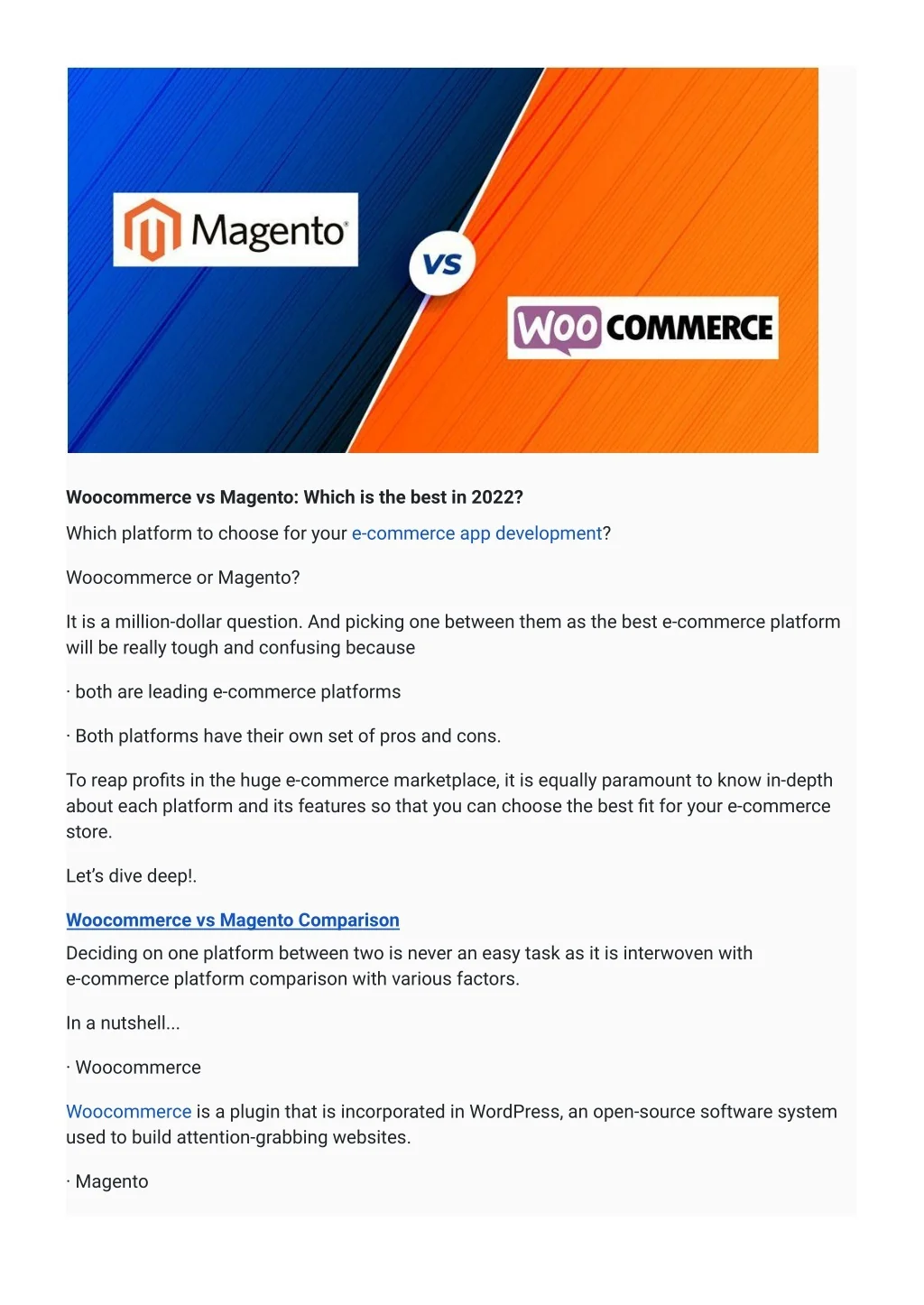 Woocommerce vs Magento: Which is the best in 2022? Which platform to choose for your e-commerce app development? Woocommerce or Magento? It is a million-dollar question. And picking one between them as the best e-commerce platform will be really tough and confusing because · both are leading e-commerce platforms · Both platforms have their own set of pros and cons. To reap profits in the huge e-commerce marketplace, it is equally paramount to know in-depth about each platform and its features so that you can choose the best fit for your e-commerce store. Let’s dive deep!. Woocommerce vs Magento Comparison Deciding on one platform between two is never an easy task as it is interwoven with e-commerce platform comparison with various factors. In a nutshell... · Woocommerce Woocommerce is a plugin that is incorporated in WordPress, an open-source software system used to build attention-grabbing websites. · Magento