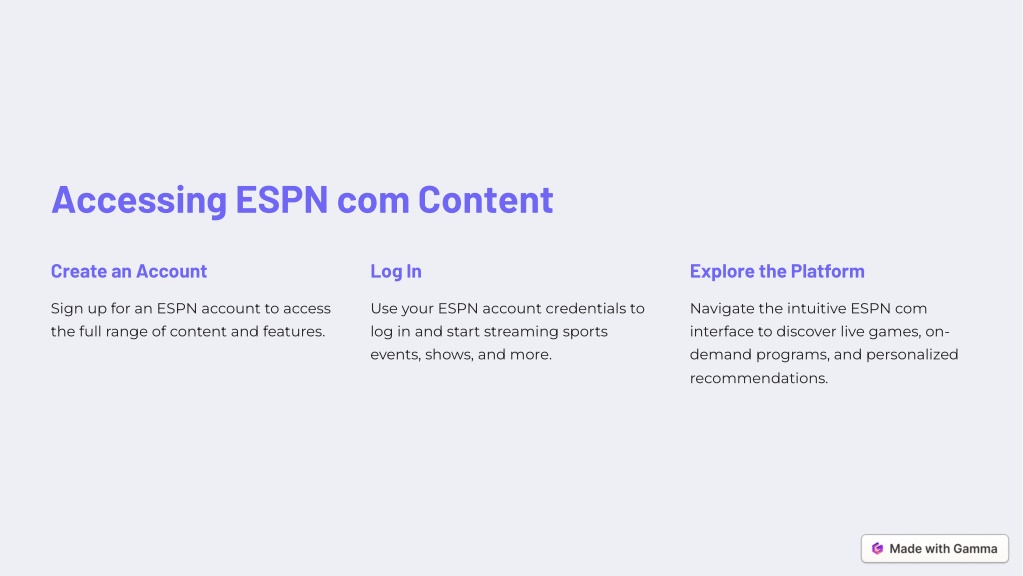 Accessing ESPN com Content Create an Account Log In Explore the Platform Sign up for an ESPN account to access the full range of content and features. Use your ESPN account credentials to log in and start streaming sports events, shows, and more. Navigate the intuitive ESPN com interface to discover live games, on- demand programs, and personalized recommendations.