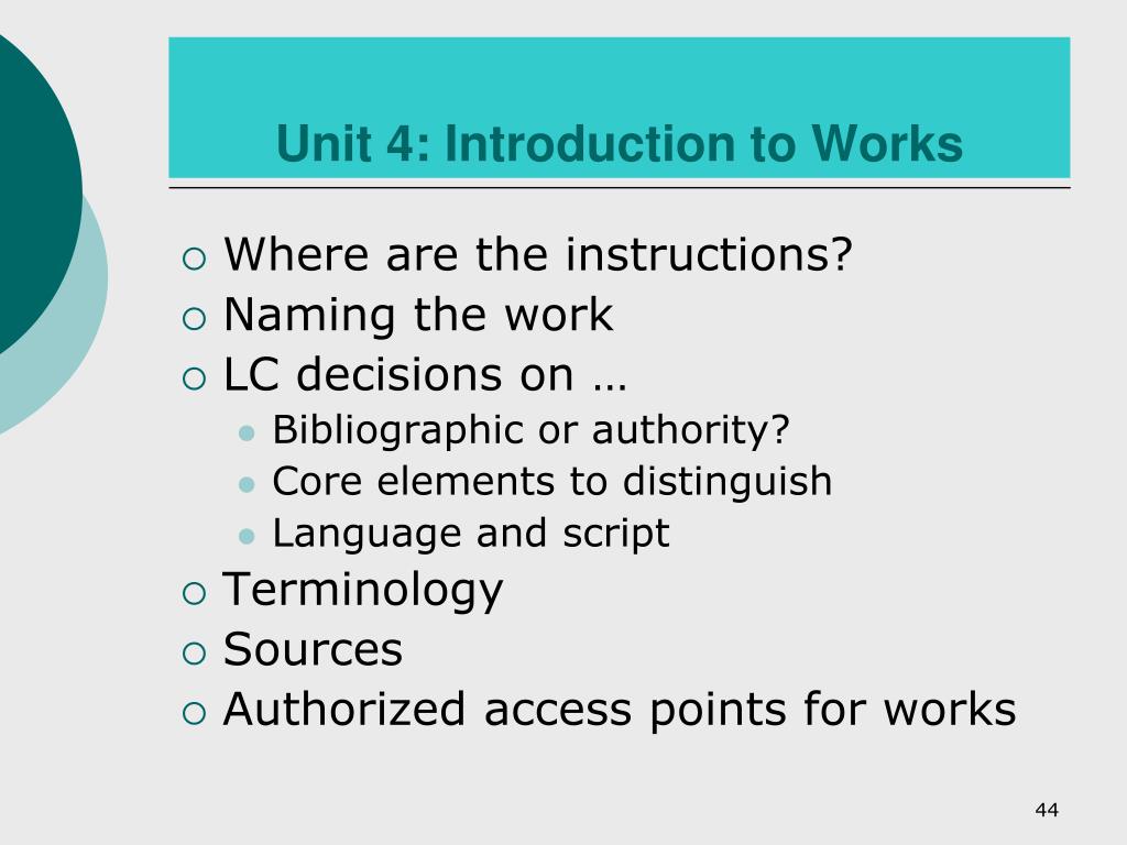 Unit 4: Introduction to Works • Where are the instructions? • Naming the work • LC decisions on … • Bibliographic or authority? • Core elements to distinguish • Language and script • Terminology • Sources • Authorized access points for works