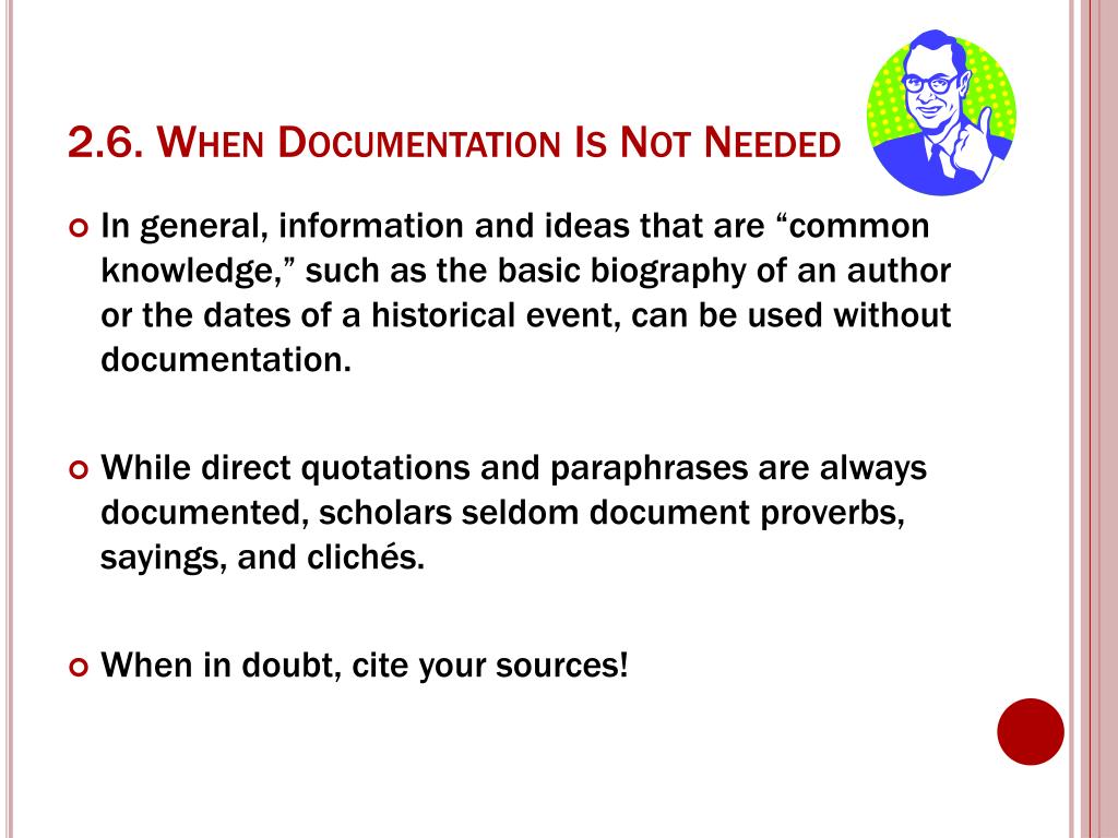 2.6. When Documentation Is Not Needed • In general, information and ideasthat are “common knowledge,” such as the basic biography of an author or the dates of a historical event, can be used without documentation. • While direct quotations and paraphrases are always documented, scholars seldom document proverbs, sayings, and clichés. • When in doubt, cite your sources!