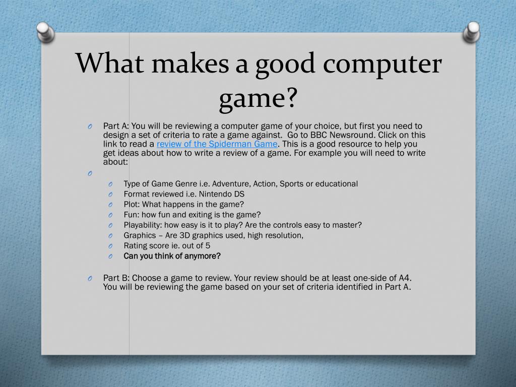 What makes a good computer game? • Part A: You will be reviewing a computer game of your choice, but first you need to design a set of criteria to rate a game against. Go to BBC Newsround. Click on this link to read a review of the Spiderman Game. This is a good resource to help you get ideas about how to write a review of a game. For example you will need to write about: • Type of Game Genre i.e. Adventure, Action, Sports or educational • Format reviewed i.e. Nintendo DS • Plot: What happens in the game? • Fun: how fun and exiting is the game? • Playability: how easy is it to play? Are the controls easy to master? • Graphics – Are 3D graphics used, high resolution, • Rating score ie. out of 5 • Can you think of anymore? • Part B: Choose a game to review. Your review should be at least one-side of A4. You will be reviewing the game based on your set of criteria identified in Part A.
