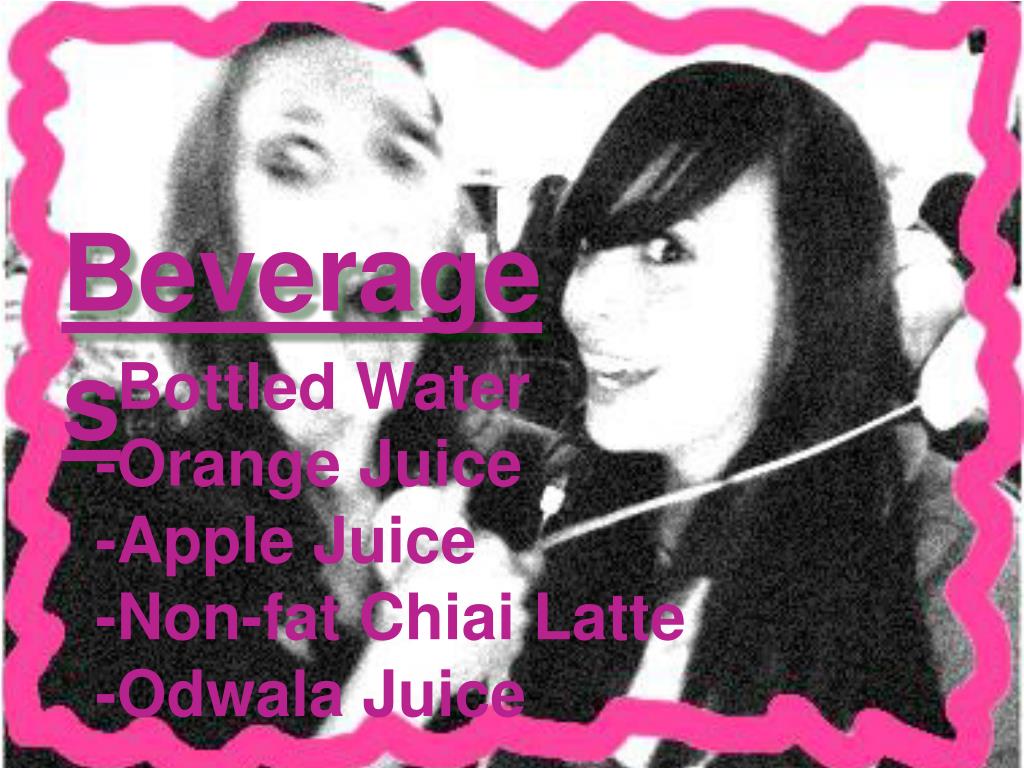Beverages -Bottled Water -Orange Juice -Apple Juice -Non-fat Chiai Latte -Odwala Juice