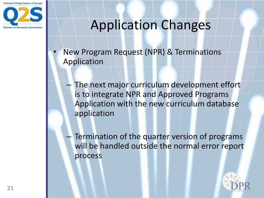 Application Changes • New Program Request (NPR) & Terminations Application • The next major curriculum development effort is to integrate NPR and Approved Programs Application with the new curriculum database application • Termination of the quarter version of programs will be handled outside the normal error report process
