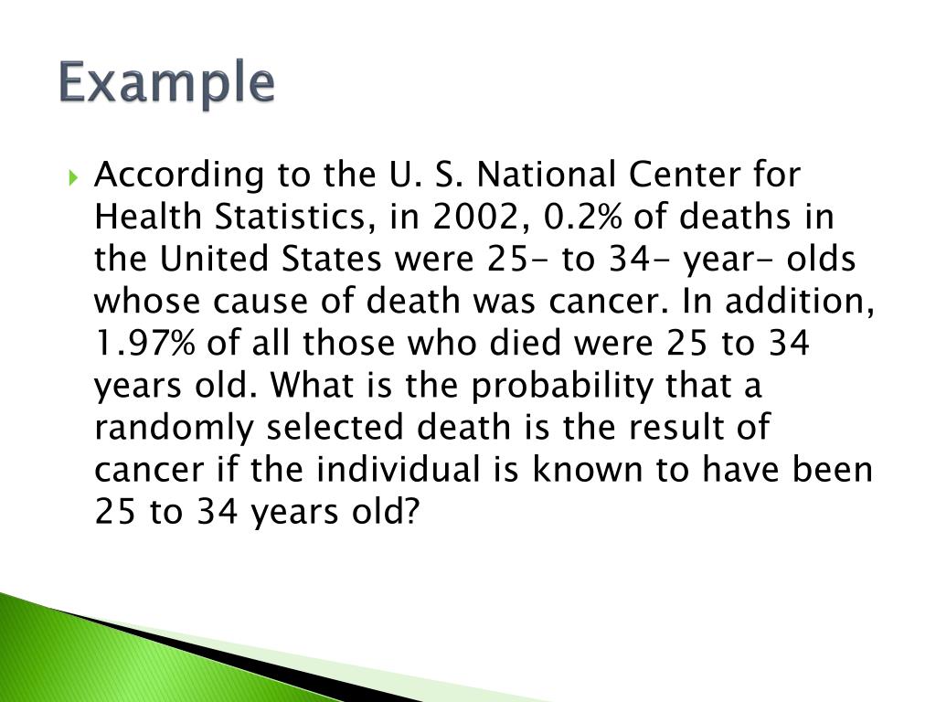Example • According to the U. S. National Center for Health Statistics, in 2002, 0.2% of deaths in the United States were 25- to 34- year- olds whose cause of death was cancer. In addition, 1.97% of all those who died were 25 to 34 years old. What is the probability that a randomly selected death is the result of cancer if the individual is known to have been 25 to 34 years old?
