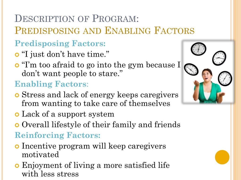 Description of Program:Predisposing and Enabling Factors Predisposing Factors: • “I just don’t have time.” • “I’m too afraid to go into the gym because I don’t want people to stare.” Enabling Factors: • Stress and lack of energy keeps caregivers from wanting to take care of themselves • Lack of a support system • Overall lifestyle of their family and friends Reinforcing Factors: • Incentive program will keep caregivers motivated • Enjoyment of living a more satisfied life with less stress