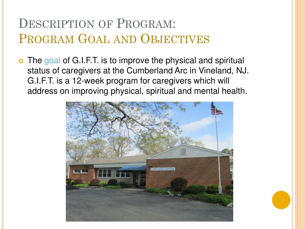 Description of Program:Program Goal and Objectives • The goal of G.I.F.T. is to improve the physical and spiritual status of caregivers at the Cumberland Arc in Vineland, NJ. G.I.F.T. is a 12-week program for caregivers which will address on improving physical, spiritual and mental health.