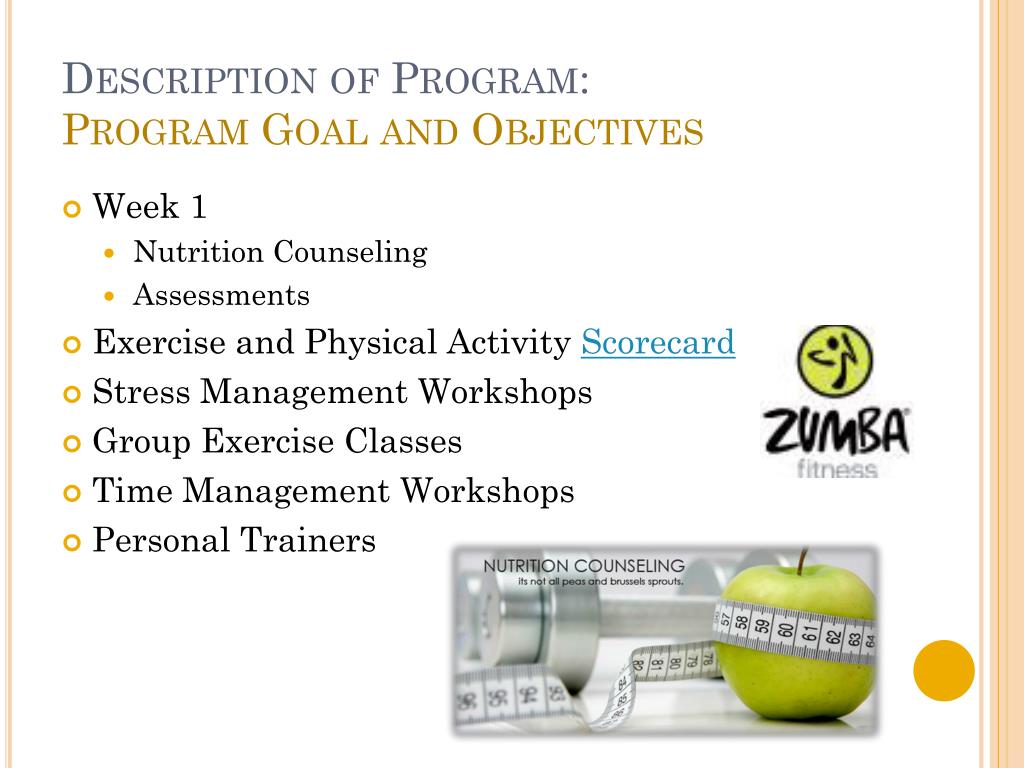 Description of Program:Program Goal and Objectives • Week 1 • Nutrition Counseling • Assessments • Exercise and Physical Activity Scorecard • Stress Management Workshops • Group Exercise Classes • Time Management Workshops • Personal Trainers