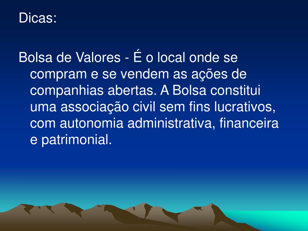 Dicas: Bolsa de Valores - É o local onde se compram e se vendem as ações de companhias abertas. A Bolsa constitui uma associação civil sem fins lucrativos, com autonomia administrativa, financeira e patrimonial.