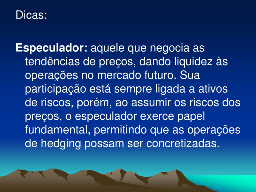 Dicas: Especulador: aquele que negocia as tendências de preços, dando liquidez às operações no mercado futuro. Sua participação está sempre ligada a ativos de riscos, porém, ao assumir os riscos dos preços, o especulador exerce papel fundamental, permitindo que as operações de hedging possam ser concretizadas.
