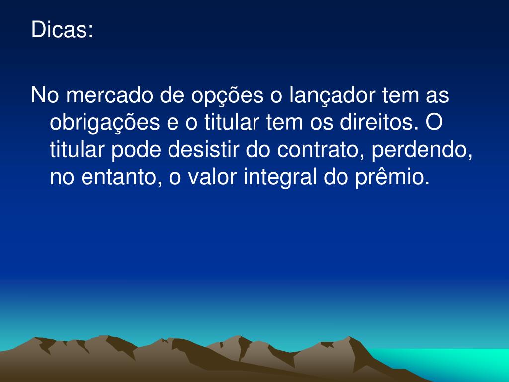 Dicas: No mercado de opções o lançador tem as obrigações e o titular tem os direitos. O titular pode desistir do contrato, perdendo, no entanto, o valor integral do prêmio.
