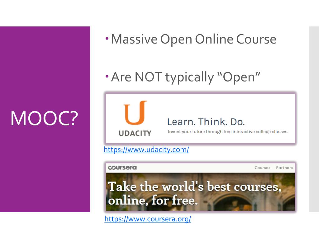 Massive Open Online Course • Are NOT typically “Open” MOOC? https://www.udacity.com/ https://www.coursera.org/