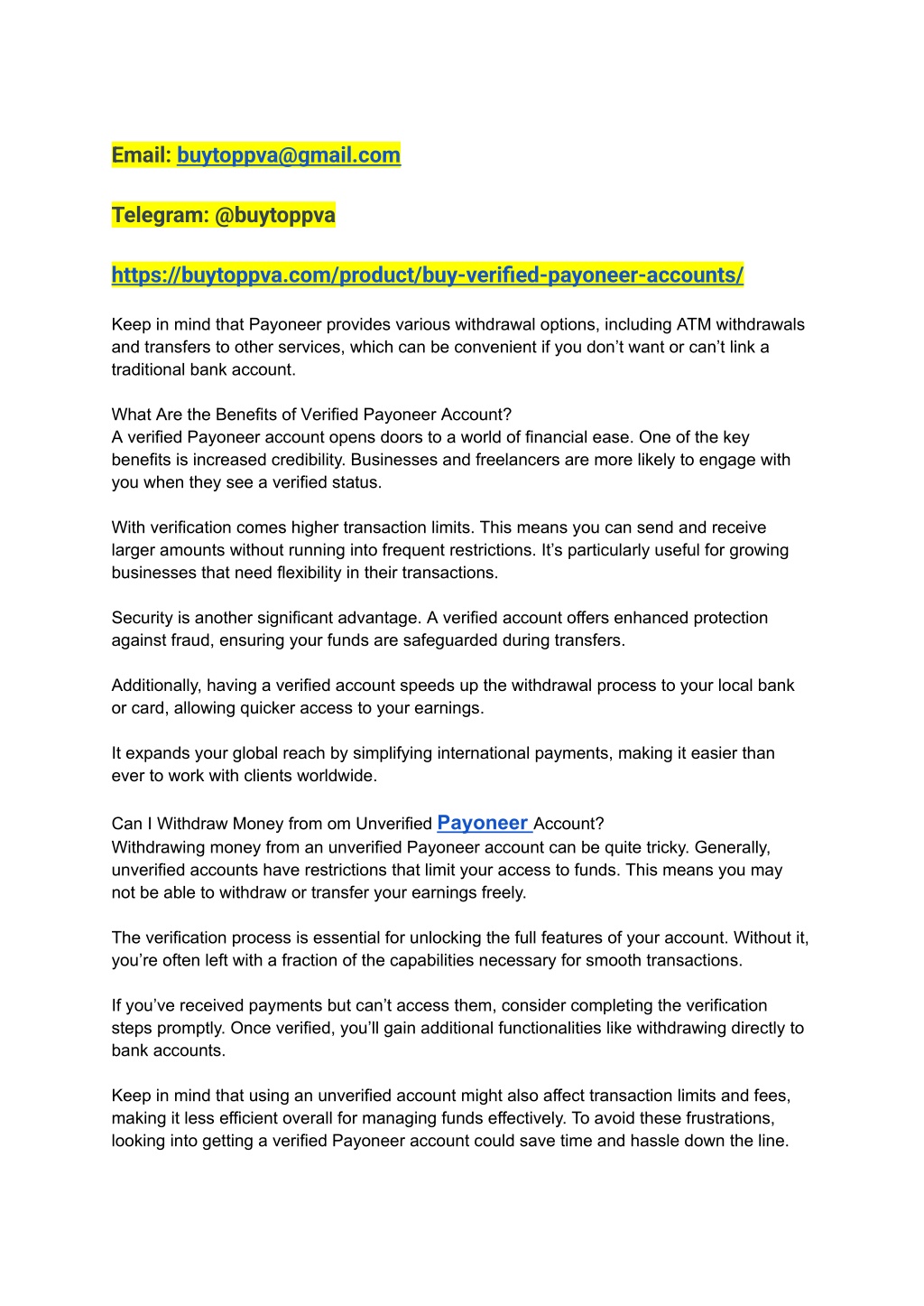 Email: buytoppva@gmail.com Telegram: @buytoppva https://buytoppva.com/product/buy-verified-payoneer-accounts/ Keep in mind that Payoneer provides various withdrawal options, including ATM withdrawals and transfers to other services, which can be convenient if you don’t want or can’t link a traditional bank account. What Are the Benefits of Vеrifiеd Payoneer Account? A verified Payoneer account opens doors to a world of financial ease. One of the key benefits is increased credibility. Businesses and freelancers are more likely to engage with you when they see a verified status. With verification comes higher transaction limits. This means you can send and receive larger amounts without running into frequent restrictions. It’s particularly useful for growing businesses that need flexibility in their transactions. Security is another significant advantage. A verified account offers enhanced protection against fraud, ensuring your funds are safeguarded during transfers. Additionally, having a verified account speeds up the withdrawal process to your local bank or card, allowing quicker access to your earnings. It expands your global reach by simplifying international payments, making it easier than ever to work with clients worldwide. Can I Withdraw Money from om Unverified Payoneer Account? Withdrawing money from an unverified Payoneer account can be quite tricky. Generally, unverified accounts have restrictions that limit your access to funds. This means you may not be able to withdraw or transfer your earnings freely. The verification process is essential for unlocking the full features of your account. Without it, you’re often left with a fraction of the capabilities necessary for smooth transactions. If you’ve received payments but can’t access them, consider completing the verification steps promptly. Once verified, you’ll gain additional functionalities like withdrawing directly to bank accounts. Keep in mind that using an unverified account might also affect transaction limits and fees, making it less efficient overall for managing funds effectively. To avoid these frustrations, looking into getting a verified Payoneer account could save time and hassle down the line.