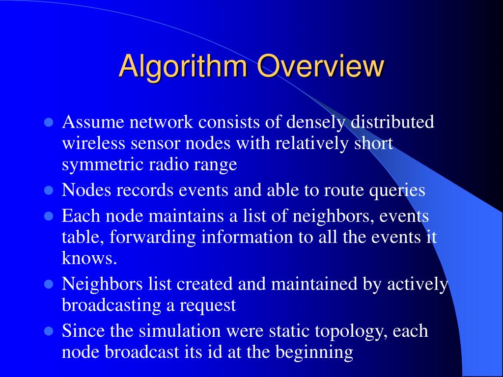 Algorithm Overview • Assume network consists of densely distributed wireless sensor nodes with relatively short symmetric radio range • Nodes records events and able to route queries • Each node maintains a list of neighbors, events table, forwarding information to all the events it knows. • Neighbors list created and maintained by actively broadcasting a request • Since the simulation were static topology, each node broadcast its id at the beginning