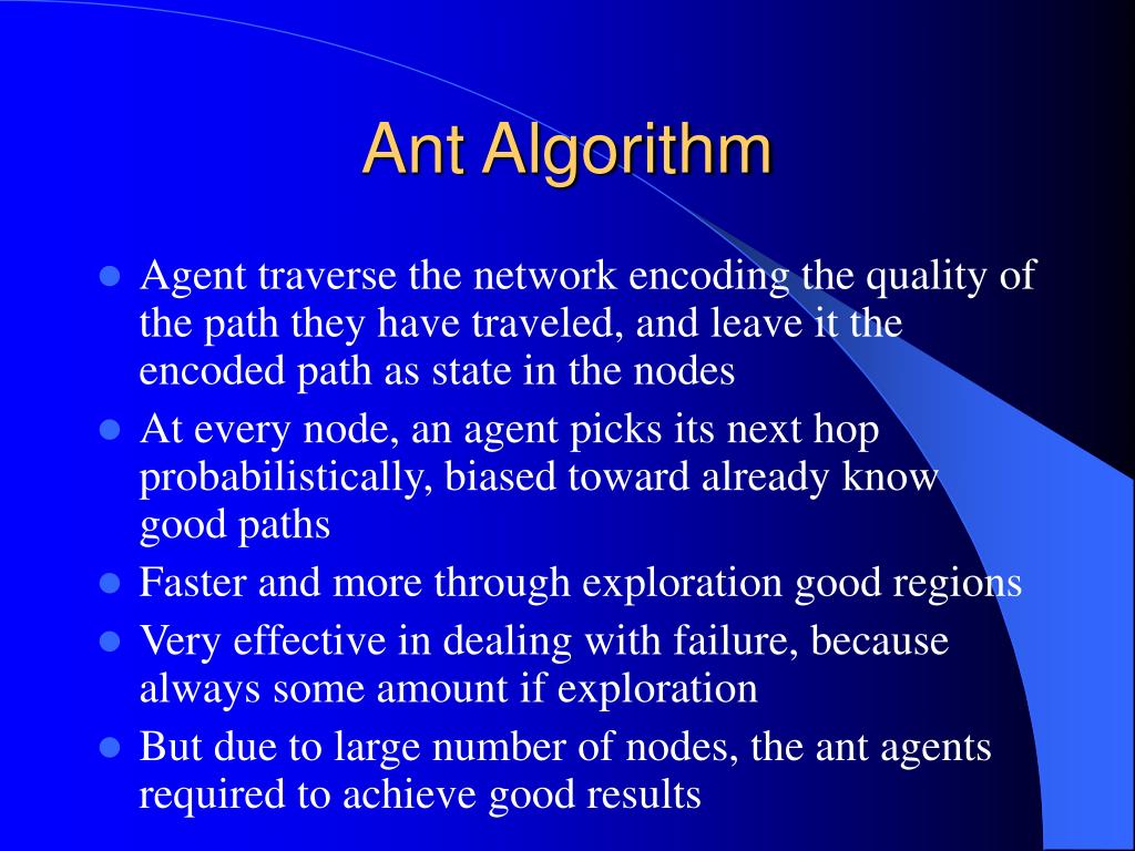 Ant Algorithm • Agent traverse the network encoding the quality of the path they have traveled, and leave it the encoded path as state in the nodes • At every node, an agent picks its next hop probabilistically, biased toward already know good paths • Faster and more through exploration good regions • Very effective in dealing with failure, because always some amount if exploration • But due to large number of nodes, the ant agents required to achieve good results