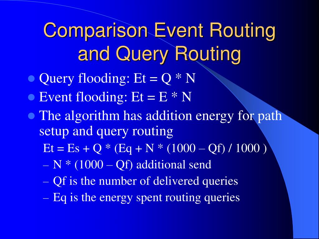 Comparison Event Routing and Query Routing • Query flooding: Et = Q * N • Event flooding: Et = E * N • The algorithm has addition energy for path setup and query routing Et = Es + Q * (Eq + N * (1000 – Qf) / 1000 ) • N * (1000 – Qf) additional send • Qf is the number of delivered queries • Eq is the energy spent routing queries