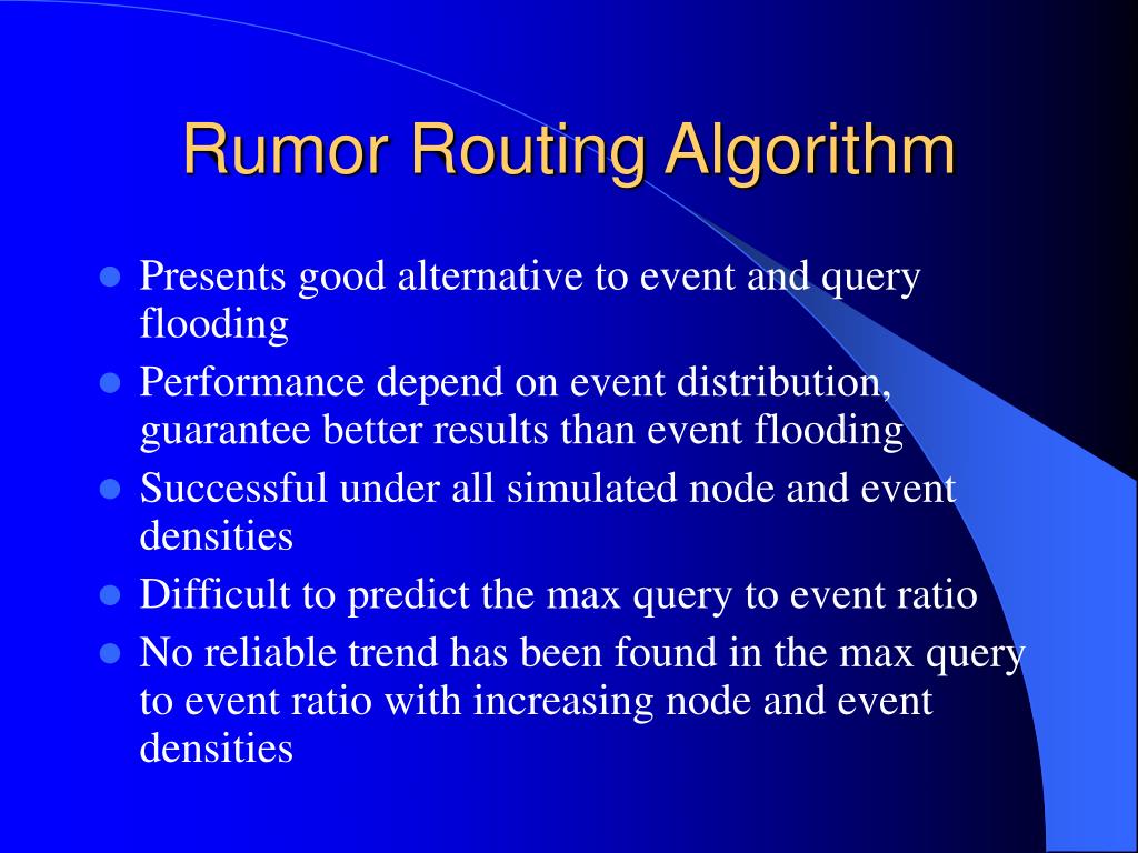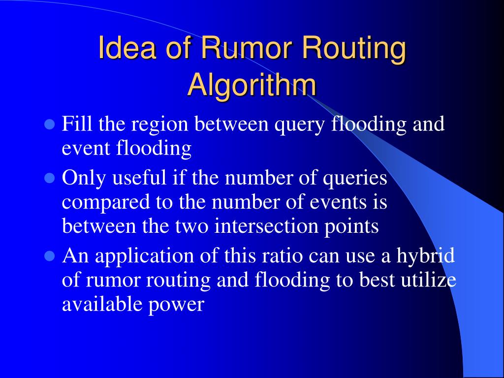 Idea of Rumor Routing Algorithm • Fill the region between query flooding and event flooding • Only useful if the number of queries compared to the number of events is between the two intersection points • An application of this ratio can use a hybrid of rumor routing and flooding to best utilize available power
